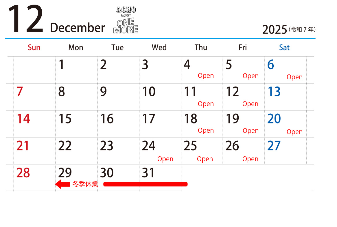 12/31~1/5まで冬季休業とさせて頂き、新年は1/6(火)から営業いたします。