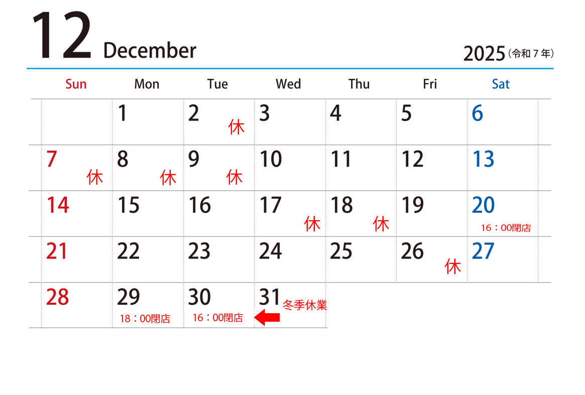12/29は18:00閉店、12/20、12/30は16:00閉店となります。